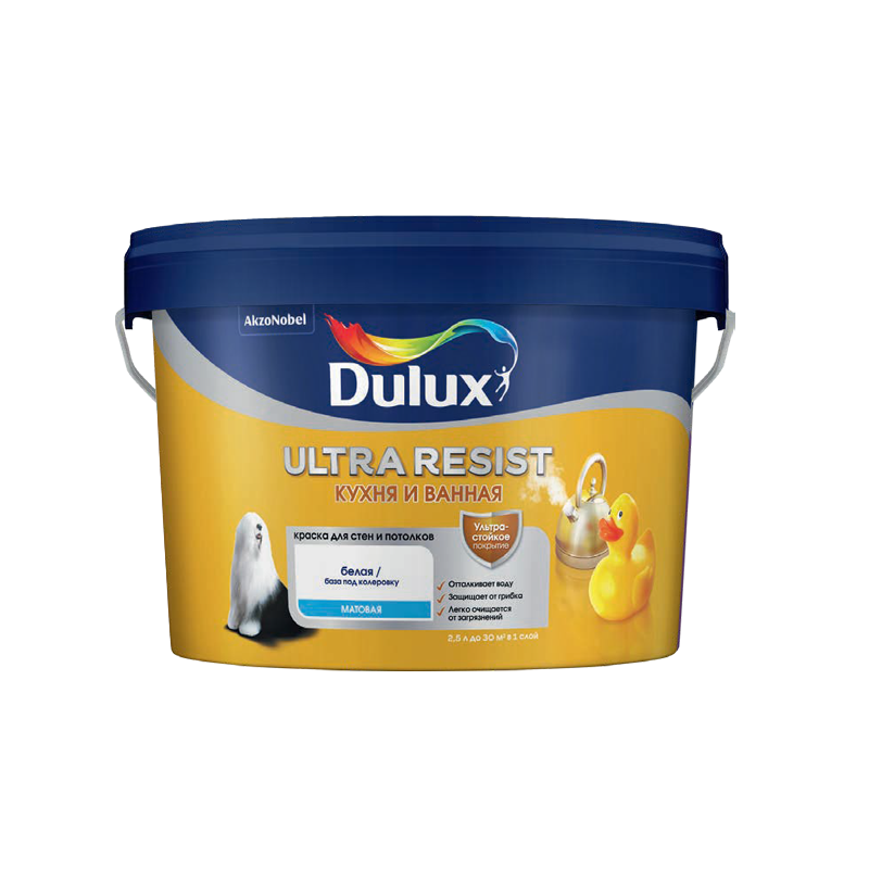 и влаги, защищает поверхность от появления плесени и грибка. Воск в составе создает «эффект лотоса», защищая от образования пятен. Особо прочное покрытие легко моется от загрязнений с использованием чистящих средств. Не имеет резкого запаха, обладает отличной укрывистостью, экономично расходуется, легко наносится без разбрызгивания и потеков. Исключительно износостойкие краски Dulux Ultra Resist