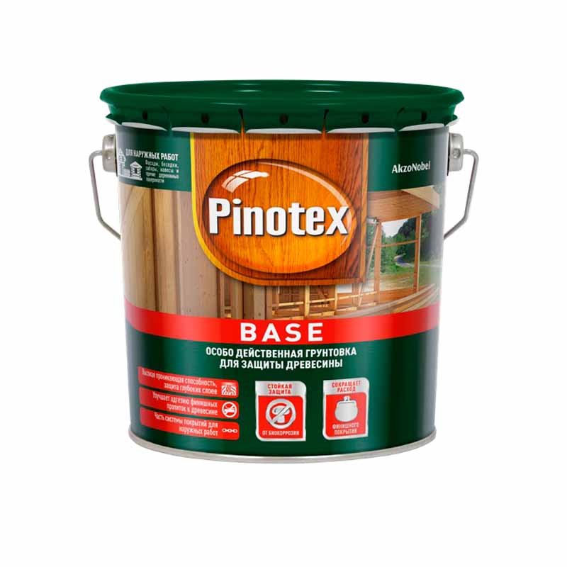 Бесцветная высокоэффективная деревозащитная грунтов-ка для обработки наружных поверхностей перед приме-нением финишных пропиток Pinotex. Грунт Pinotex Base улучшает качество деревянной поверхности, выравнивая впитывающую способность древесины и обеспечивая равномерное нанесение последующих слоев финишных пропиток или лака. Грунт значительно улучшает адгезию финишных материалов, повышая долговечность покрытий и их декоративные свойства. Pinotex Base обладает высо-кой проникающей способностью, эффективно защищая глубокие слои древесины от плесени, синевы и гнили. Грунт является частью системы покрытий для наружных работ. Комплексное использование грунта и пропиток обе-спечивает двойную активную защиту поверхности древе-сины.